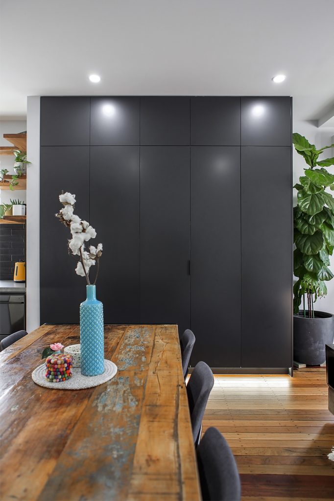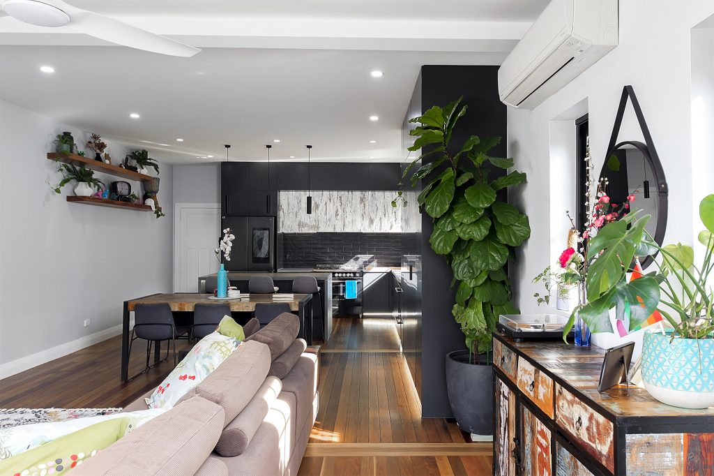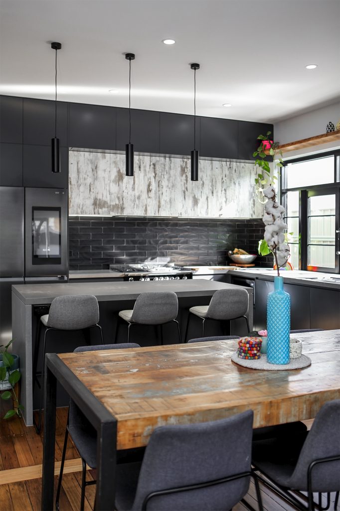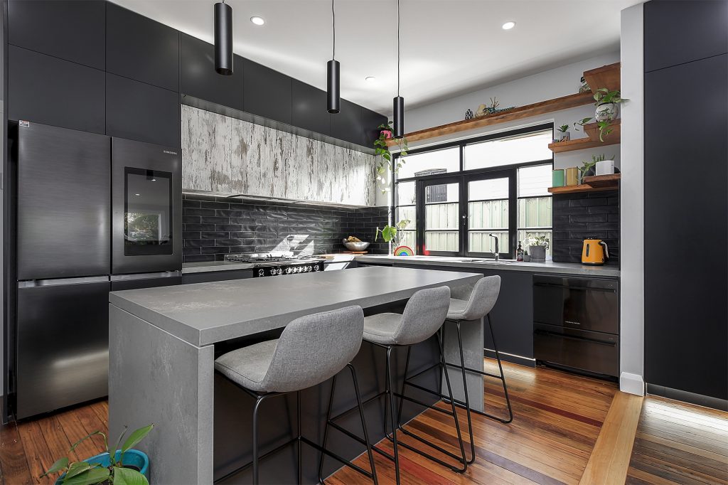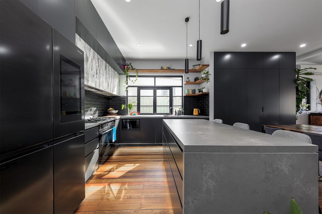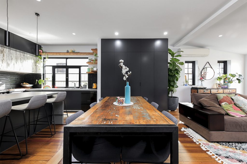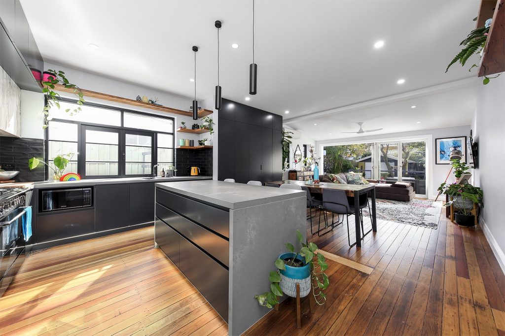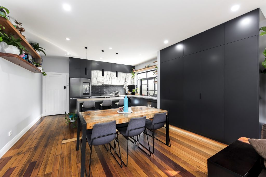 Complete with industrial look and feel, black commercial grade windows. We re-sanded and polished the old style strip flooring. Black joinery with black finishes and appliances.