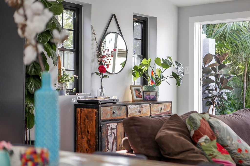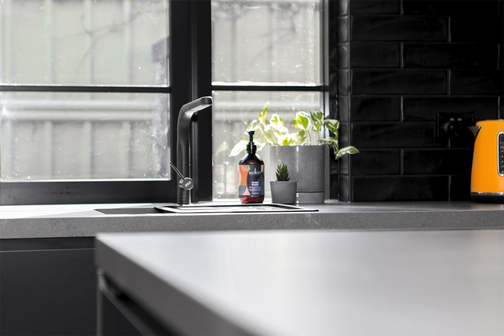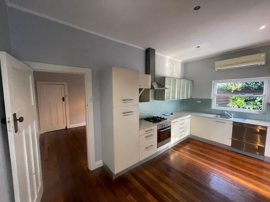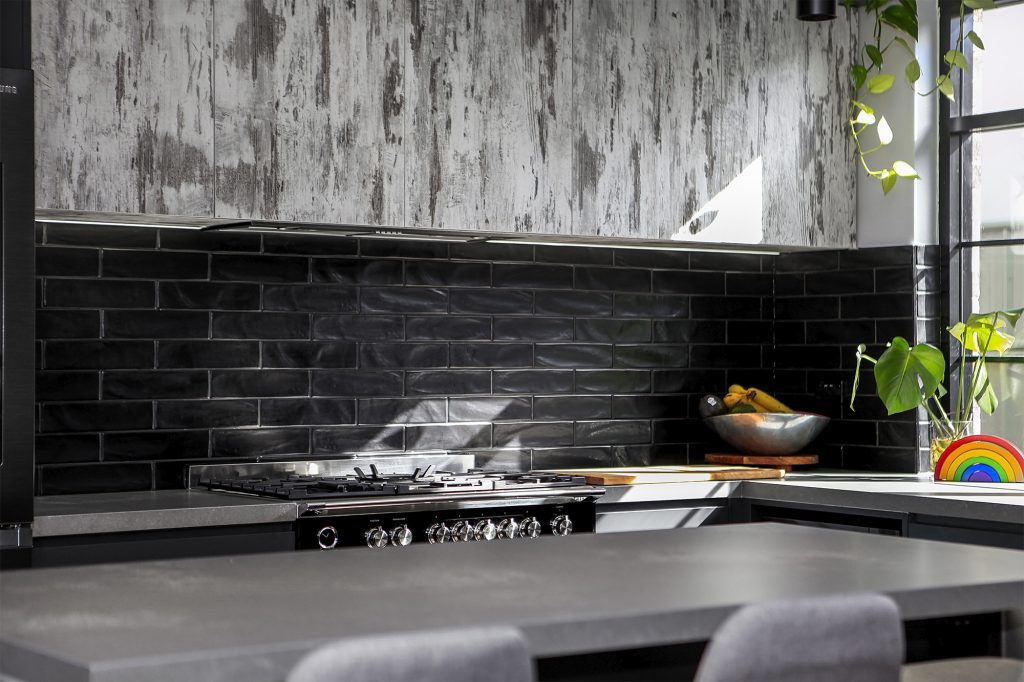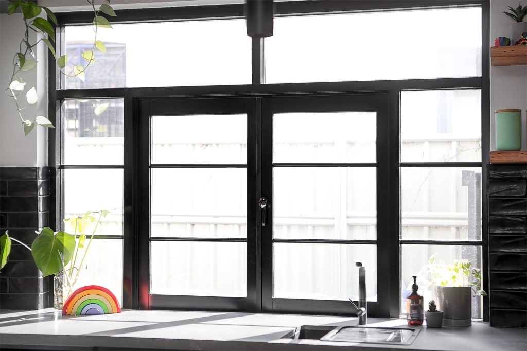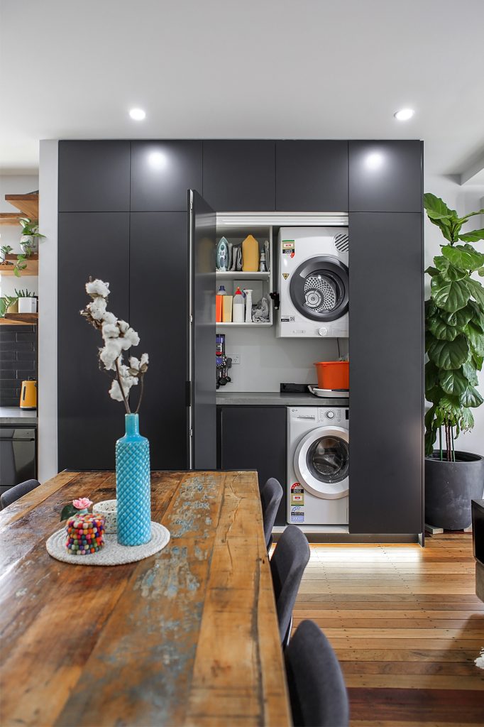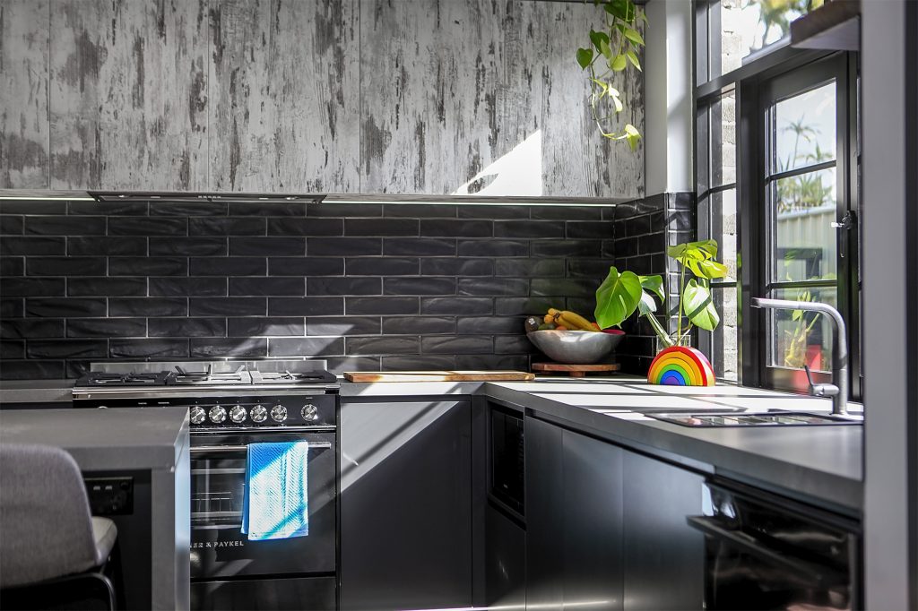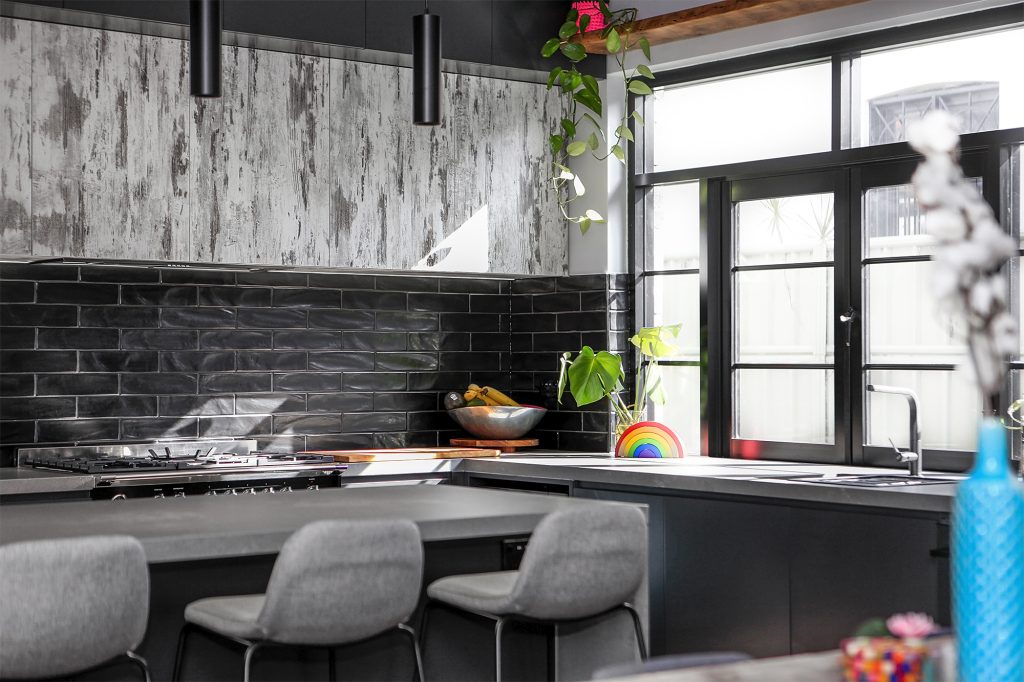 Complete with industrial look and feel, black commercial grade windows. We re-sanded and polished the old style strip flooring. Black joinery with black finishes and appliances.