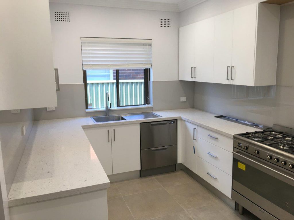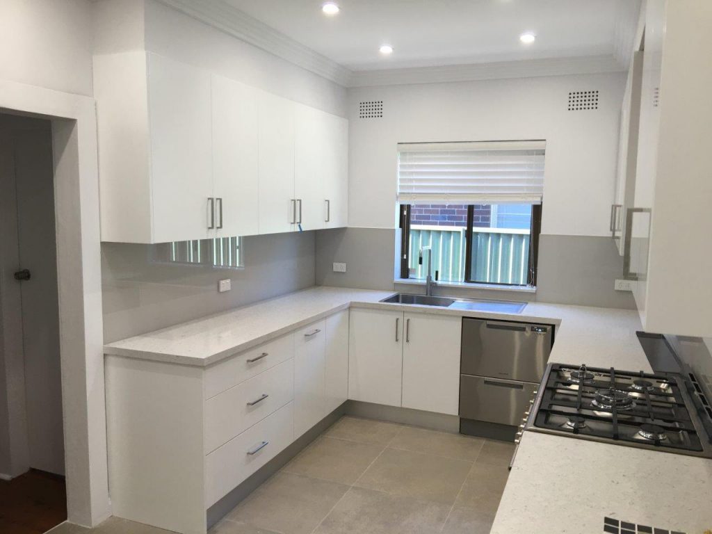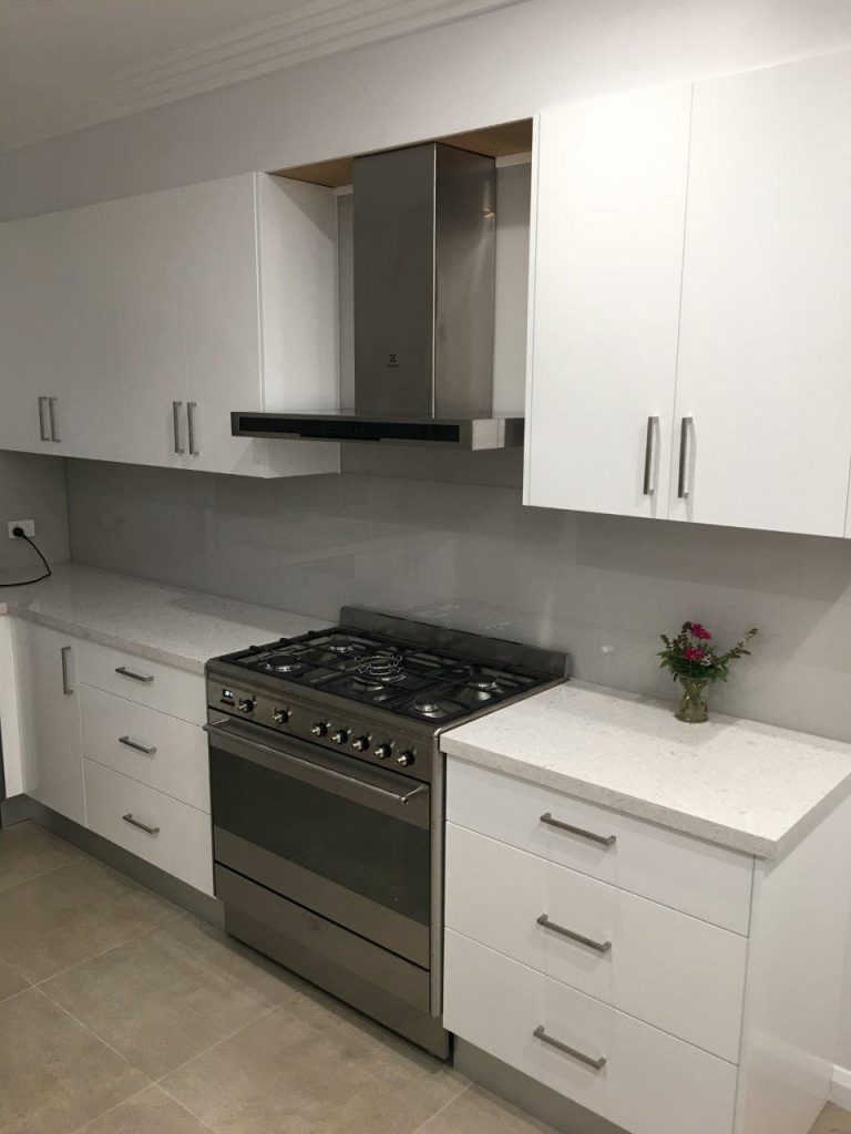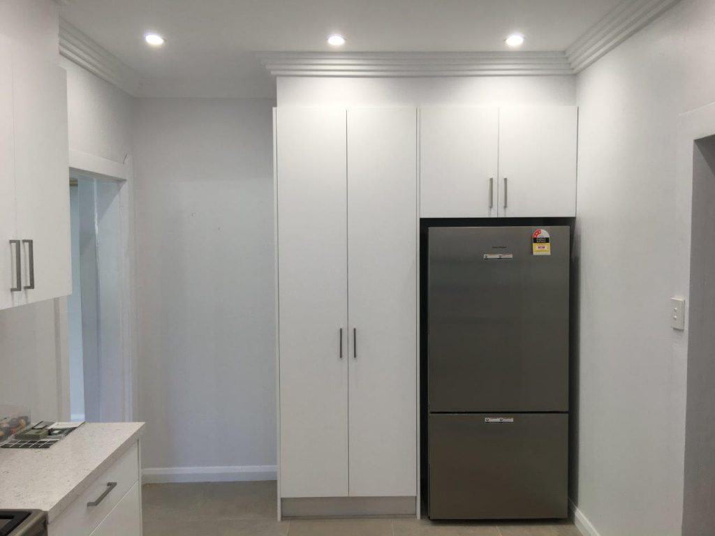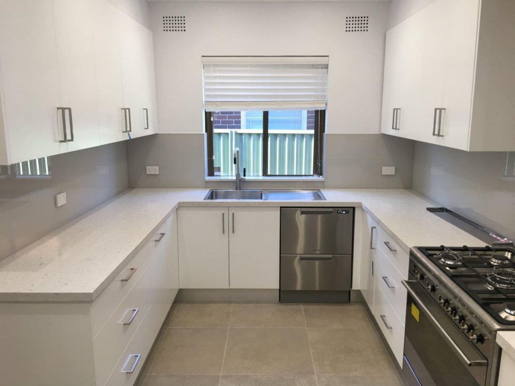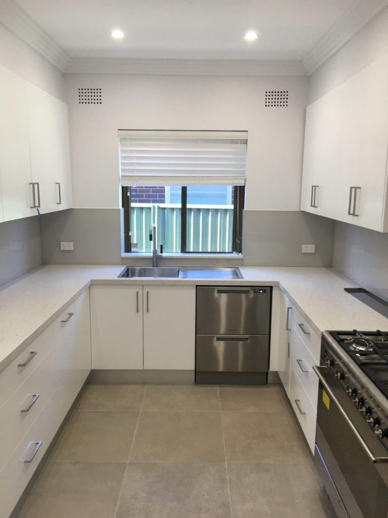 New kitchen works consisted of new tiled flooring, painting works, new gyprock ceiling, white polyurethane cabinetry, stone bench top, glass splash back, brushed aluminium kick boards, stainless steel appliances and brushed stainless handles.