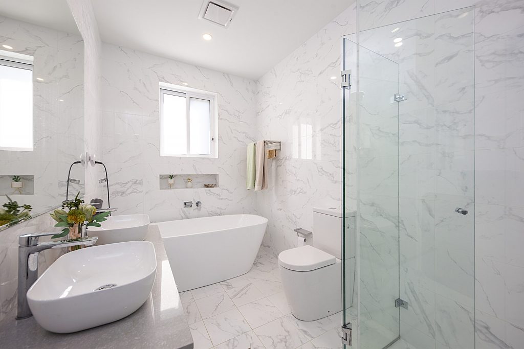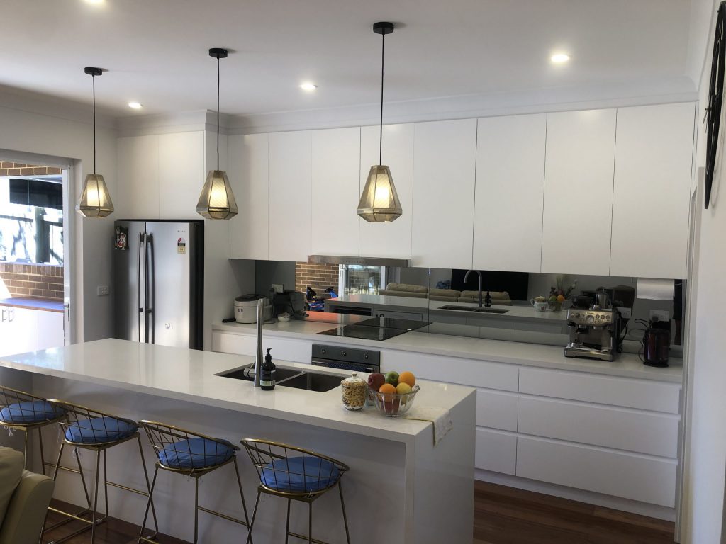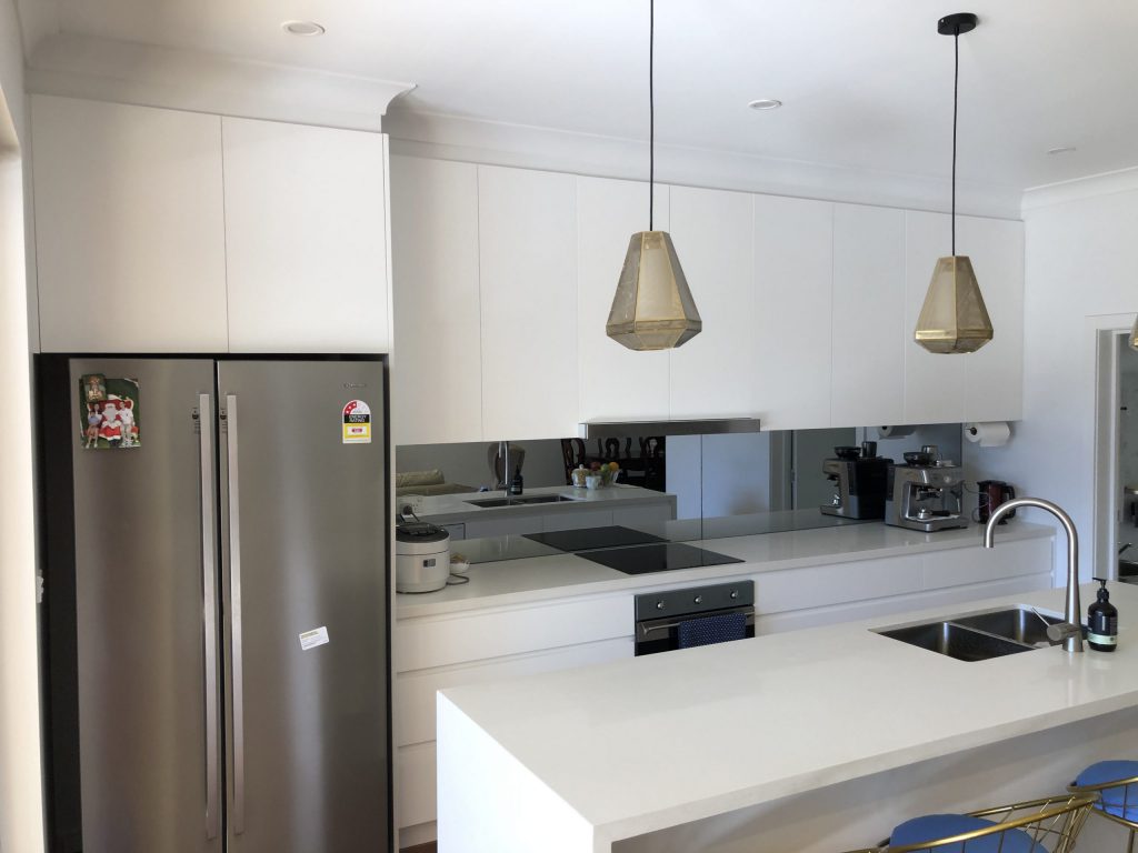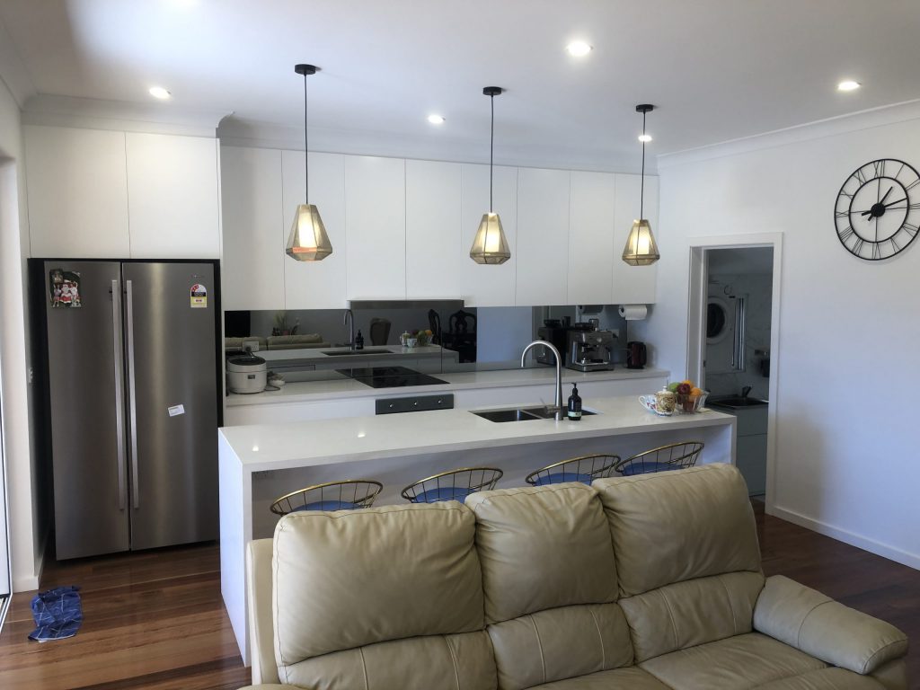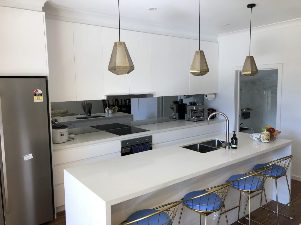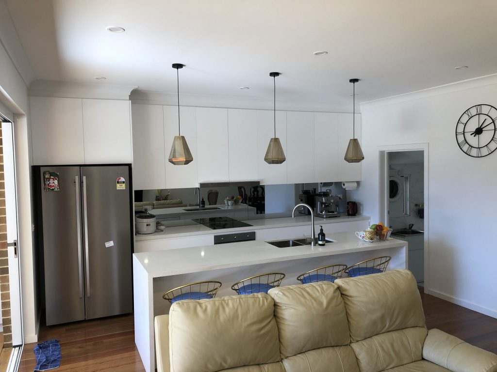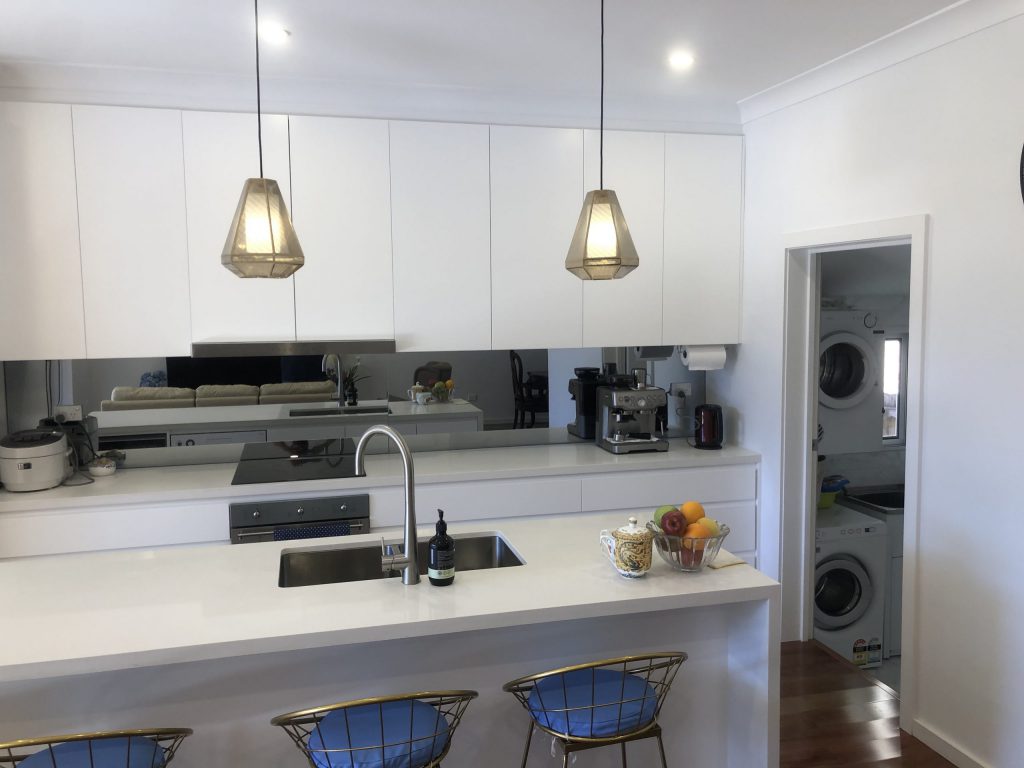 The kitchen consisted of stone bench tops with waterfall sides to island bench, polyurethane cabinetry with soft close hinges and finger pull doors.